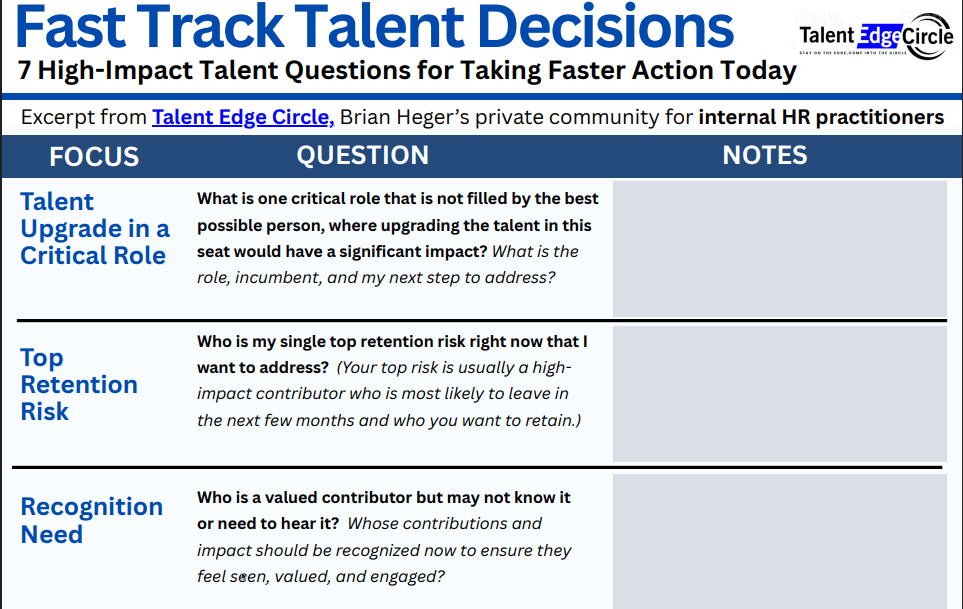 My new cheat sheet with sample questions leaders can use to accelerate timely talent decisions into immediate action.