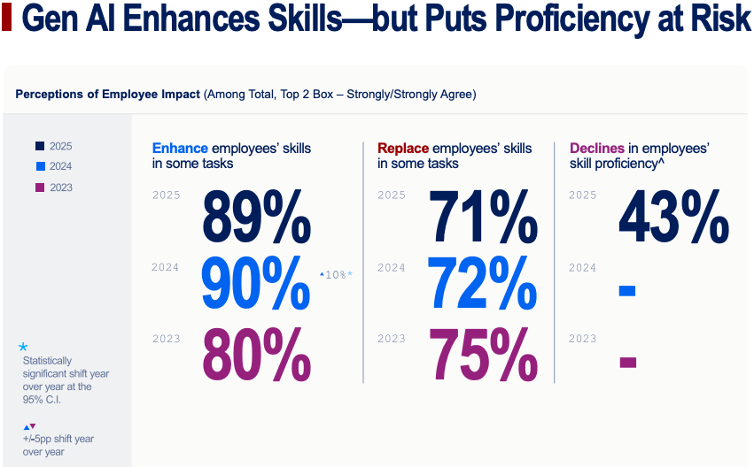 This recently published 90-page report provides a detailed view of the evolution of GenAI in organizations over the past three years (2023 through 2025). At a high level, the evolution can be described as: 2023 (Exploration): Initial curiosity, cautious use for simple tasks. 2024 (Experimentation): Increased pilots, focus on proving value. 2025 (Accountable Acceleration): Integration into core operations, ROI measurement, risk mitigation, and talent development. The study, now in its third year, is sponsored by Wharton Human-AI Research, part of the Wharton AI & Analytics Initiative at the Wharton School, University of Pennsylvania; GBK Collective performed the research and analysis. The cross-sectional study covers various topics, ranging from where the common use cases are, where returns are emerging, and which people and process-levers could convert mainstream use into sustainable ROI. Page 56 begins a section titled The Human Capital Lever: Aligning Talent, Training & Trust. One interesting chart on page 60 shows that while AI is enhancing employees’ skills in some tasks, there are concerns about skills atrophy (declines in employees’ skill proficiency). Given the breadth of this report, readers will need to dig into it to explore its many insights. As a bonus, you can check out a working paper by researchers at Harvard Business School and Stanford University titled, The GenAI Wall Effect: Examining the Limits to Horizontal Expertise Transfer Between Occupational Insiders and Outsiders. It shows that while GenAI helps bridge expertise gaps, it eventually reaches a point where it can no longer meaningfully narrow the gap between occupational insiders and outsiders. One implication is that domain knowledge and contextual understanding remain essential for interpreting GenAI-enabled output.