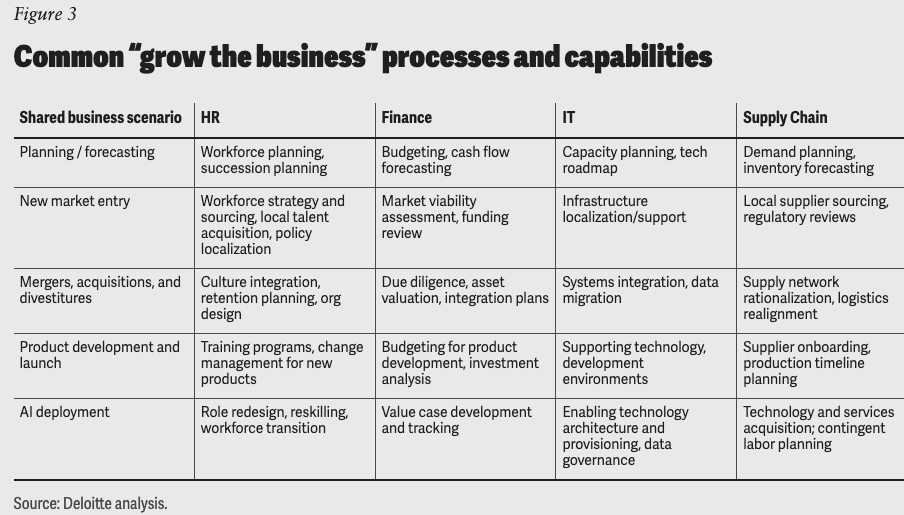 As organizations rethink how work gets organized in response to AI, faster business cycles, and growing pressure for cross-functional execution, this Deloitte Insights article raises an important question: are traditional corporate functions such as HR, finance, IT, legal, and procurement still fit for purpose? Its core argument is that these functions were designed for specialization and efficiency, but many are no longer set up to support the speed, agility, and coordination that today's business priorities require, and Deloitte's survey of 9,000+ leaders found only 7% are making great progress here. One framework in the article separates work that helps "run the business" from work that helps "grow the business." Run-the-business work covers repeatable, transaction-heavy activities suited for standardization, automation, and shared delivery models. Grow-the-business work (as shown in the post image) centers on strategic scenarios such as AI deployment, M&A, and market expansion, where success depends on aligning expertise around a shared outcome and is better suited for cross-functional teams organized around those outcomes. The distinction matters for design: not all functional work should be reorganized the same way, and clarity on which category a given activity falls into can help leaders make more deliberate decisions about structure, accountability, and where to invest in capability.